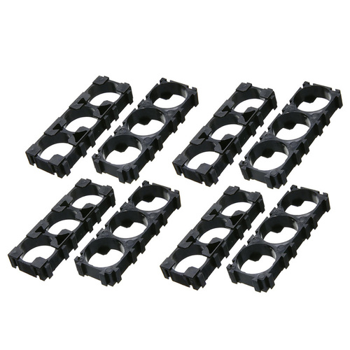 براکت نگهدارندهی باتری لیتیومی، برای ساخت اصولی پک باتری استفاده میشود. این وسیله باتریها را در فواصل منظم در کنار هم نگه میدارد تا شما بتوانید عملیات اتصال باتریها به وسیلهی جوش نوار نیکل یا لحیم کردن سیم را انجام دهید. فاصلهی ایجاد شده بین باتریها خطر اتصالی در صورت آسیب دیدگی پوستهی پلاستیکی باتریها را کاهش میدهد. برای ساخت پک باتری، دو عدد براکت برای دو سر باتریها مورد نیاز است. این مدل قابلیت نگهداری 3 عدد سلول لیتیوم یون 18650 را داراست. یعنی با استفاده از 8 عدد براکت موجود در بسته، میتوانید چهار پک 3 تایی و یا یک پک 12 تایی باتری ایجاد کنید. برای اتصال باتریها توصیه میشود از نوار نیکل و جوش نقطهای استفاده شود تا هم باتریها در اثر حرارت لحیم آسیب نبینند و هم حجم پک کمتر و نتیجهی کار شکیلتر شود. از قابلیتهای بسیار خوب این نگهدارندهها این است که کنارههای براکتها به شکلی است که میتوان آنها را به هم متصل نمود تا پکهای بزرگتری ایجاد شود. یعنی کنارههای هر براکت مانند قطعات پازل میتواند به براکت دیگر متصل شود. نمونهی این اتصالها را میتوانید در تصاویر مشاهده کنید.